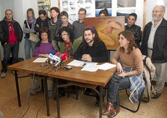 Rueda de prensa ofrecida en Gasteiz, en la sede de Salhaketa, sobre el próximo juicio contra el subdirector de Seguridad de la cárcel de Langraitz acusado de abuso sexual contra varias presas. En la imagen, en el centro, Marta Aldanondo y Carlos Hernández.